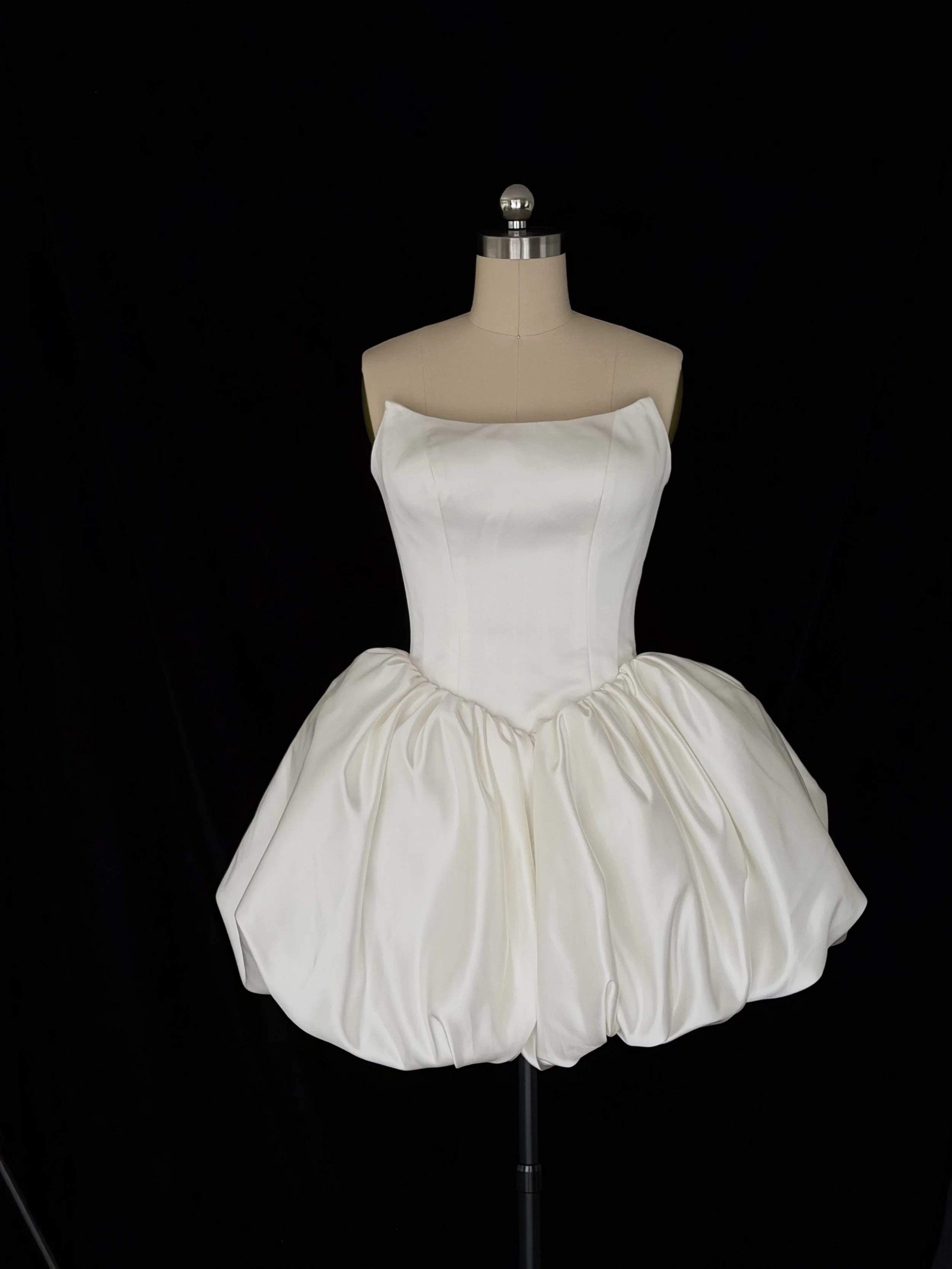 Caro is a structured mini dress defined by a sculpted bodice and a cloud-like bubble skirt.