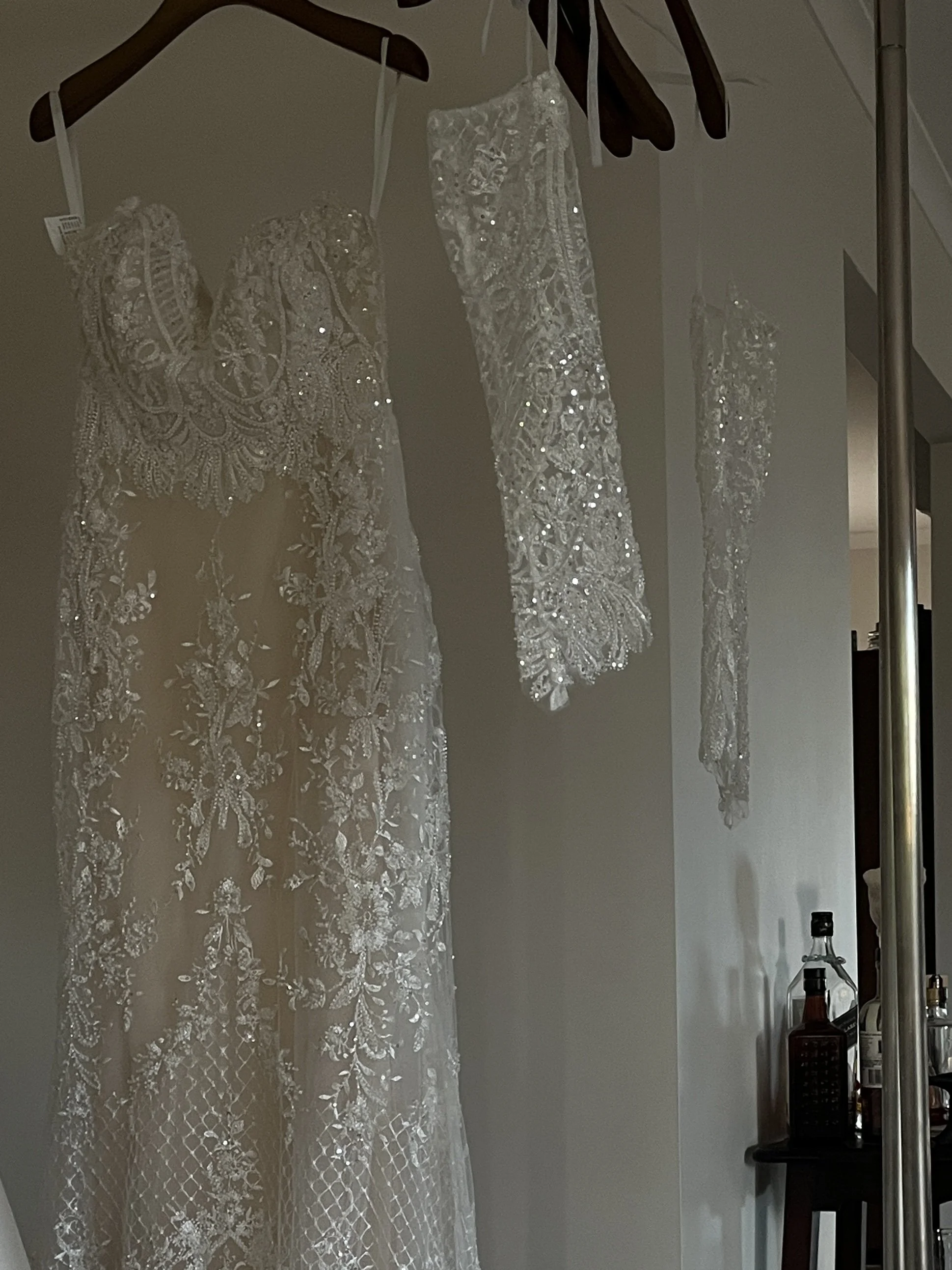 Rental gowns are offered in their existing condition and cannot be altered.This option is best suited for brides whose measurements align closely with the original fit.
