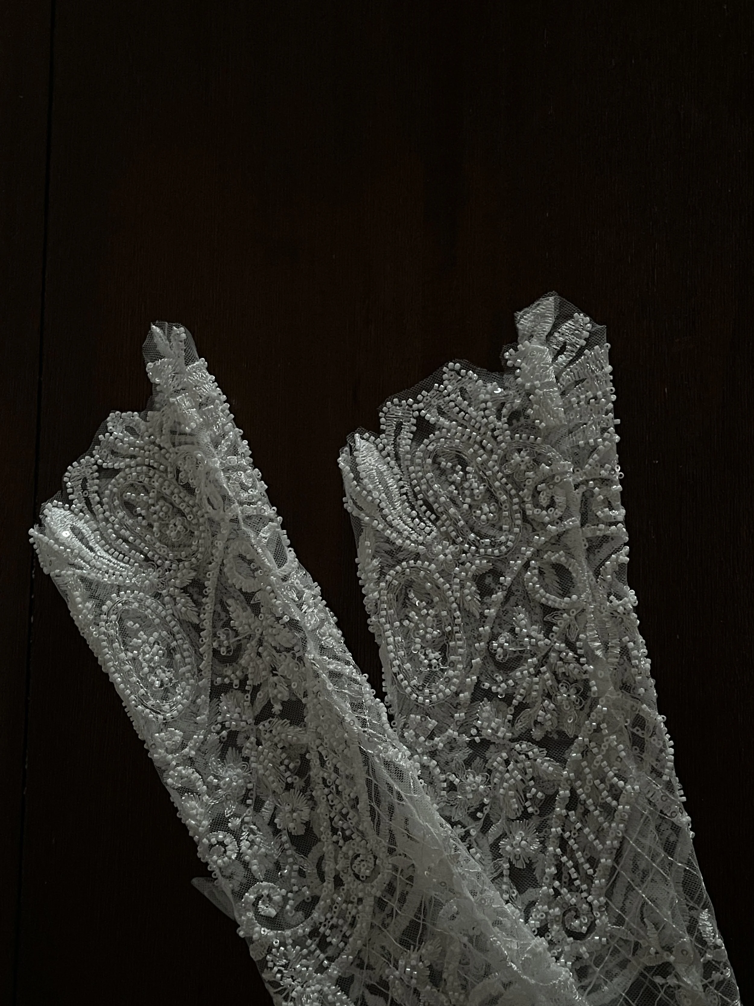 A matching pair of lace gloves is available, crafted in the same embroidered and beaded lace for a cohesive, considered look.