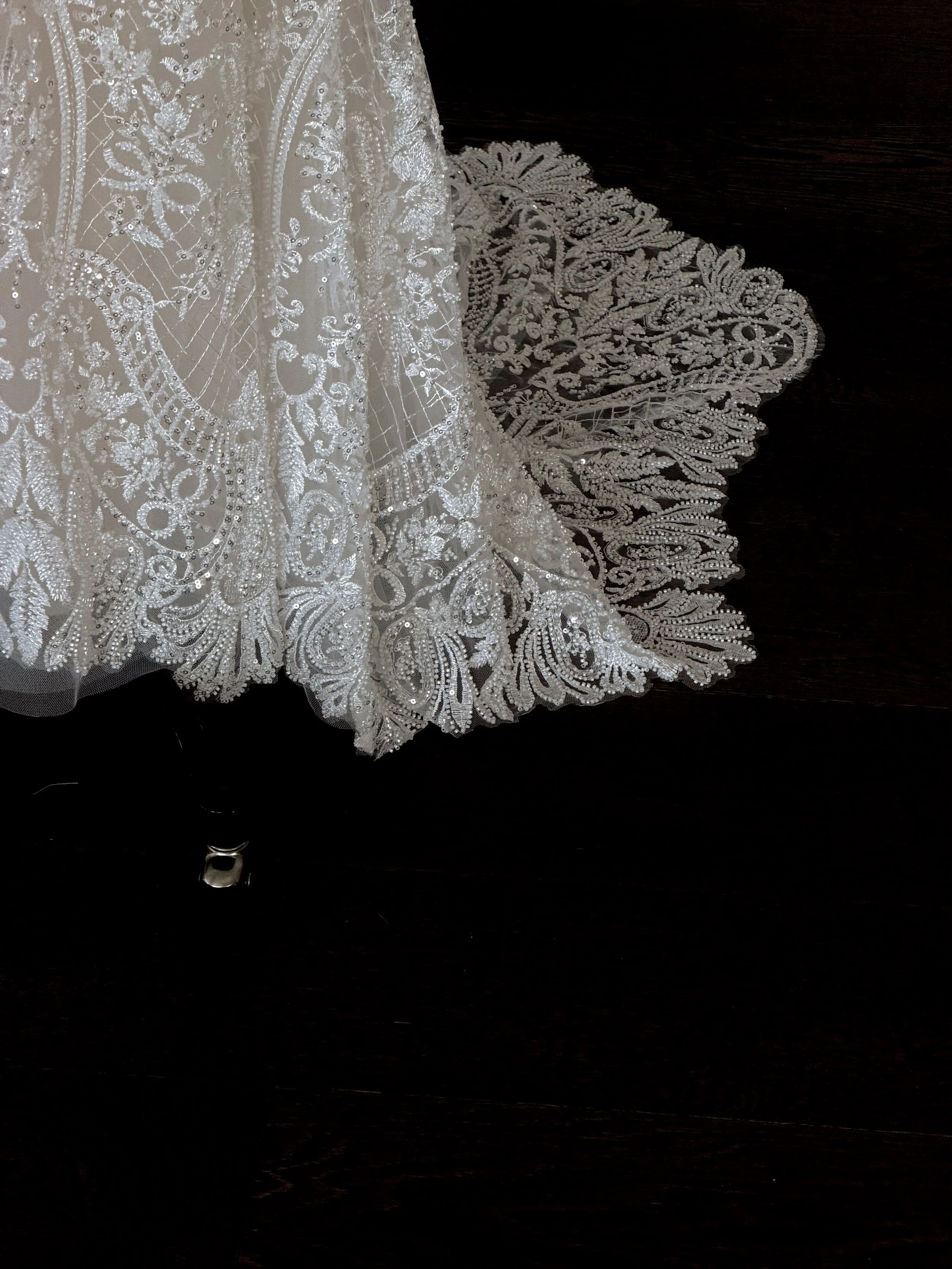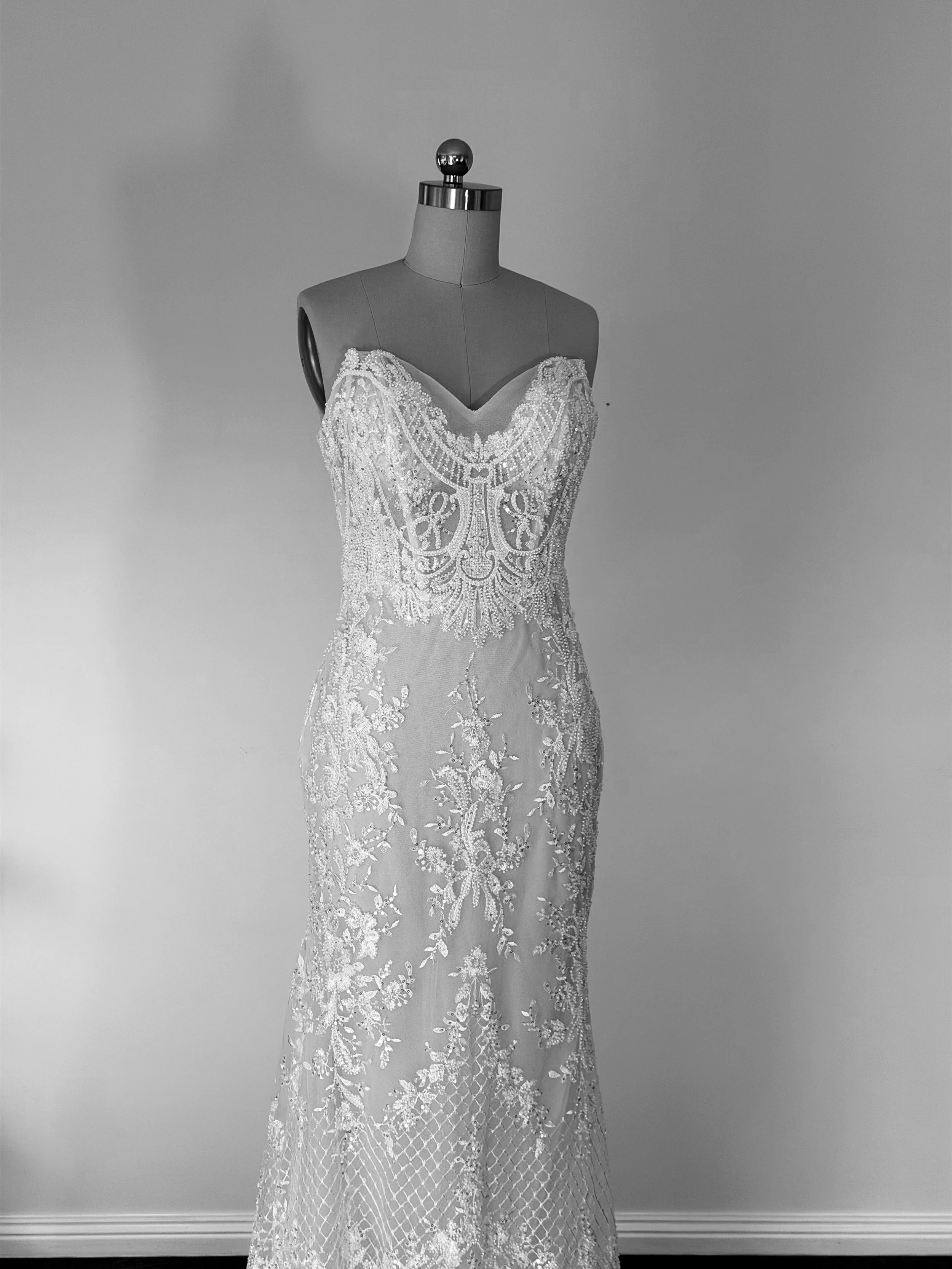 Estelle is a strapless fitted gown defined by its structured corset bodice and intricate beaded lace overlay. The lace is applied over nude tulle to enhance motif definition and dimensional depth, finishing with a scalloped hem that extends into a soft, controlled train.