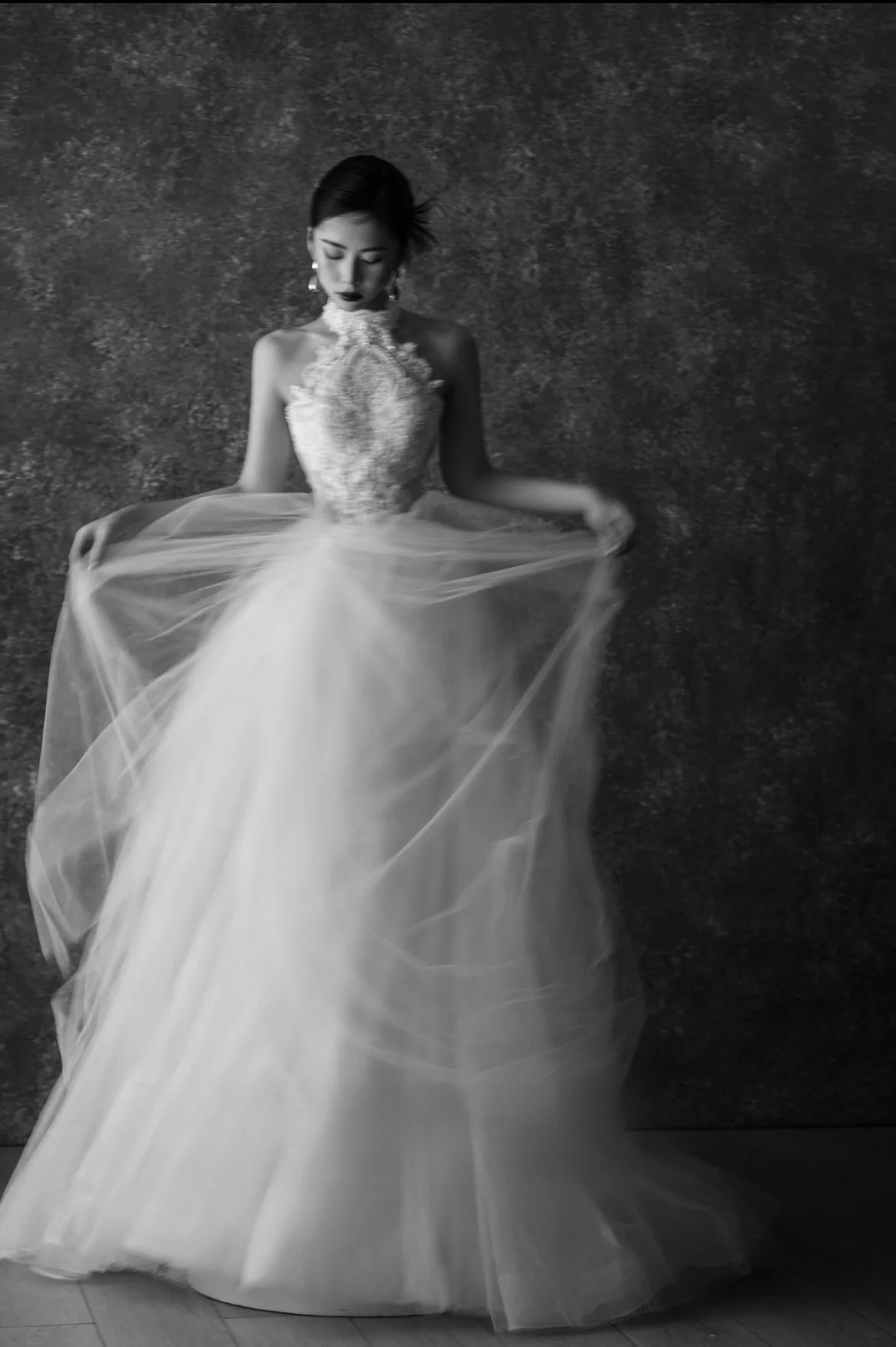 A high halter neckline frames the shoulders with precision, leading into a fitted bodice built from fine lace over a sheer base. The lace is densely beaded, creating depth and weight through surface rather than volume.