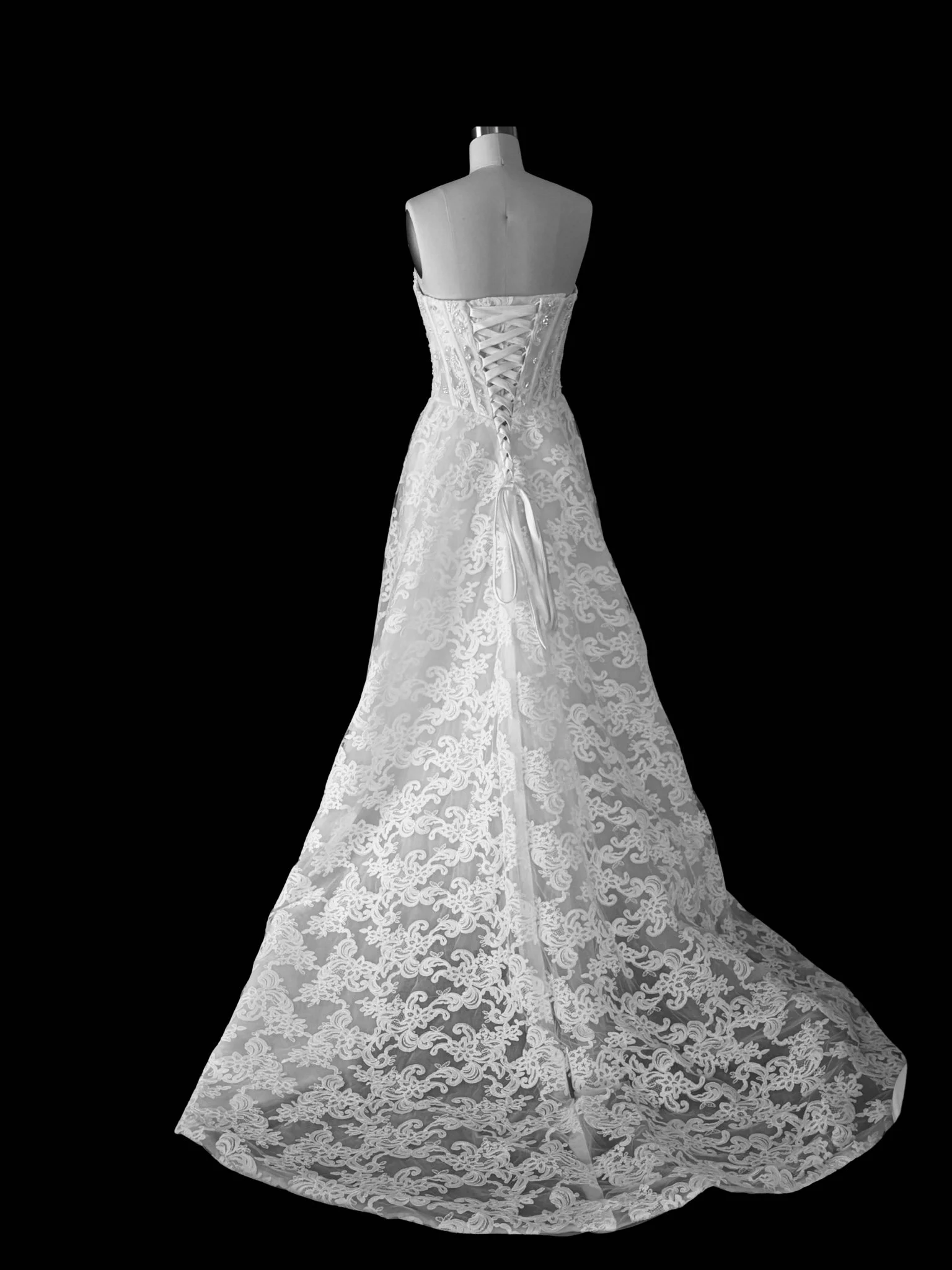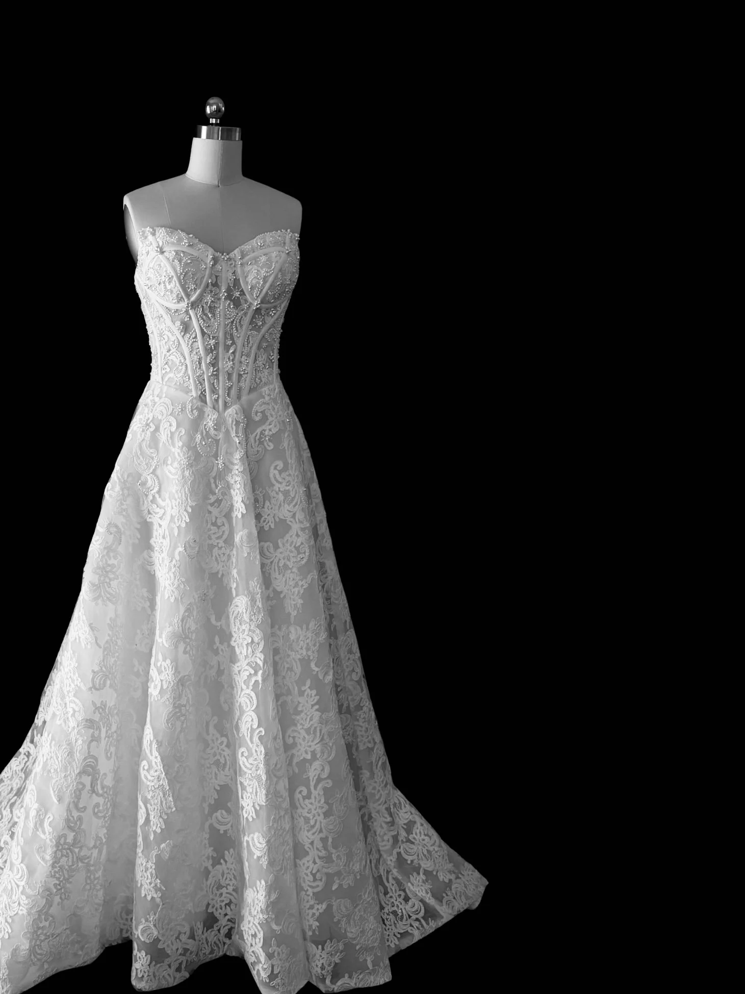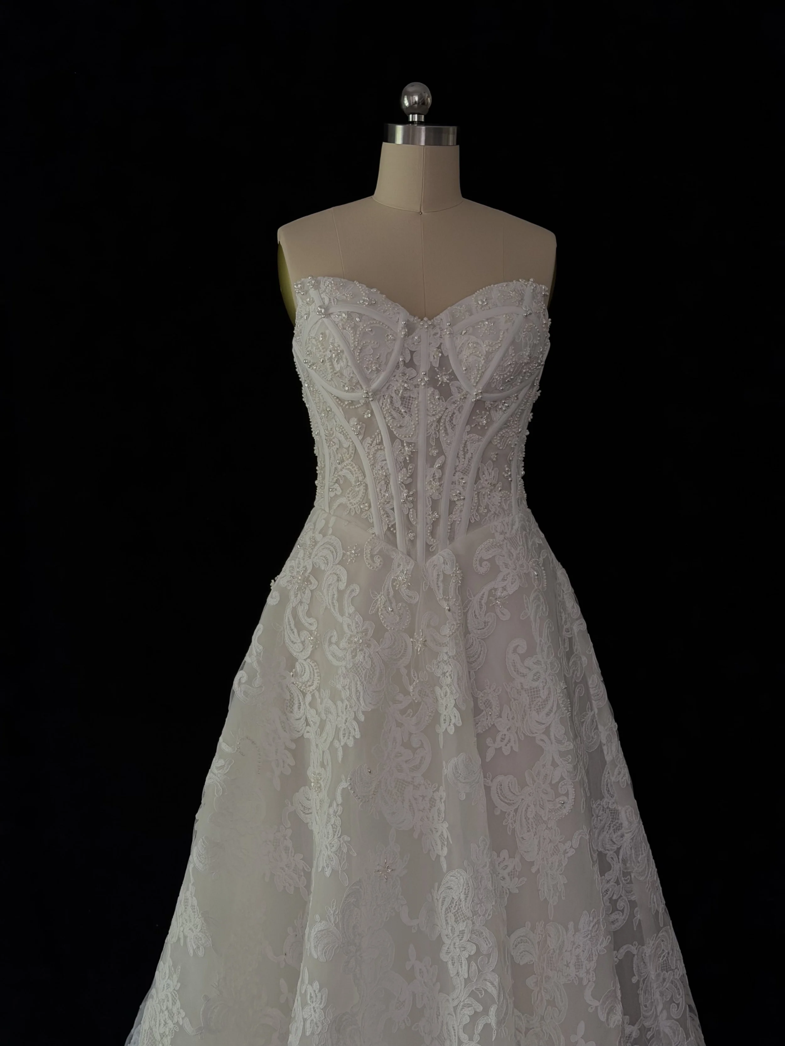 Lyra is a strapless corset A-line gown defined by a structured bodice and a corded lace skirt.