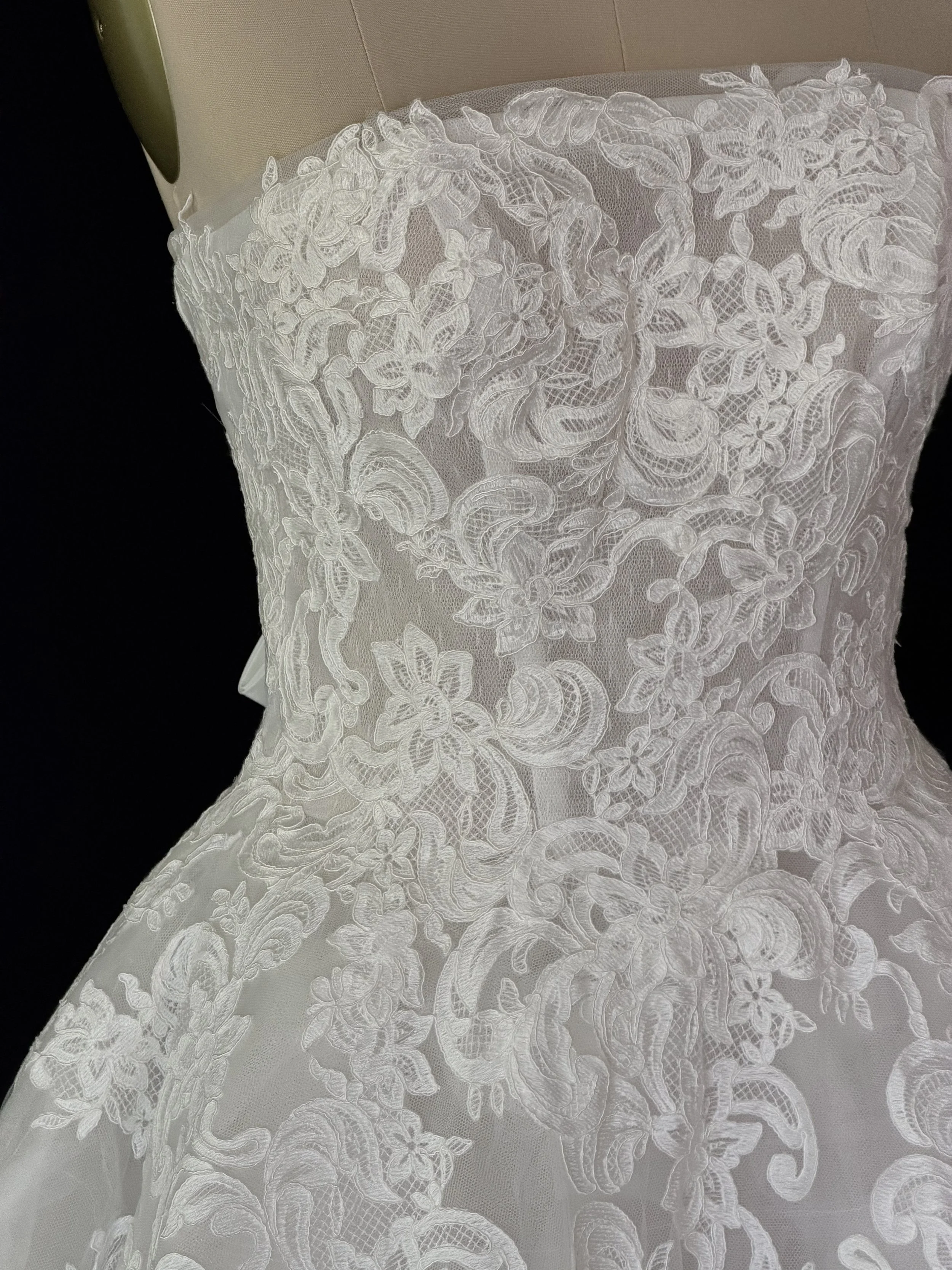 Marion is built with a fully corseted bodice, reinforced with internal boning for structure and support. The lace is applied under tension, giving the surface a firm hand feel and allowing the pattern to read cleanly across the body.
