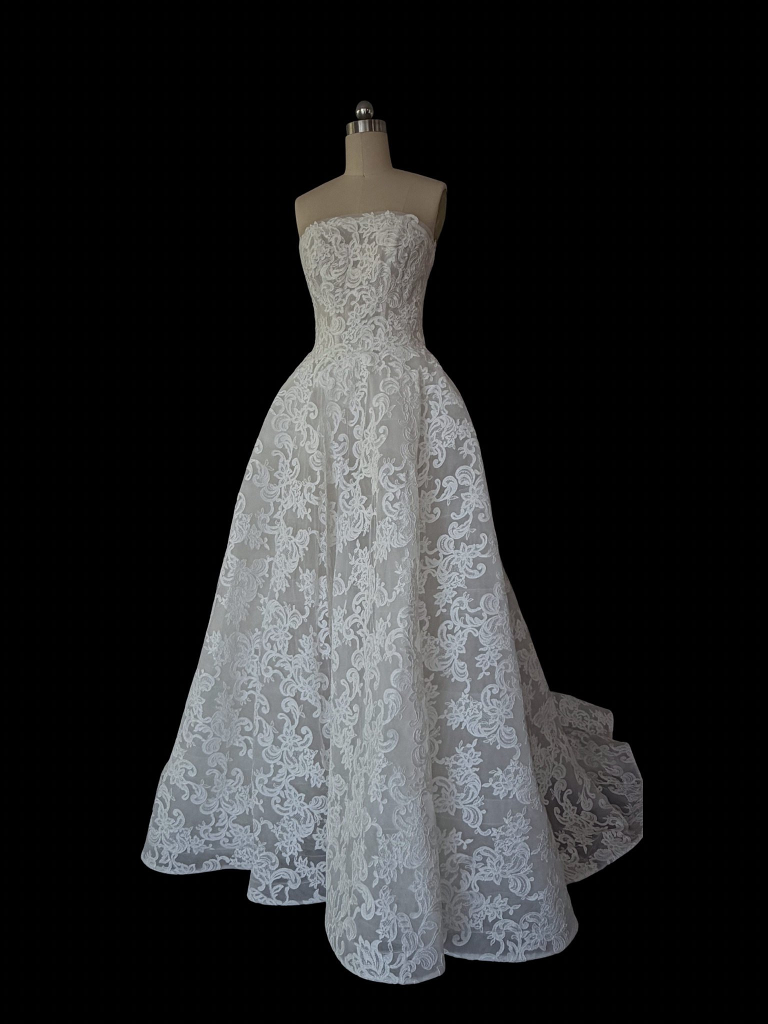 Rental gowns are offered in their existing condition and cannot be altered.This option is best suited for brides whose measurements align closely with the original fit.