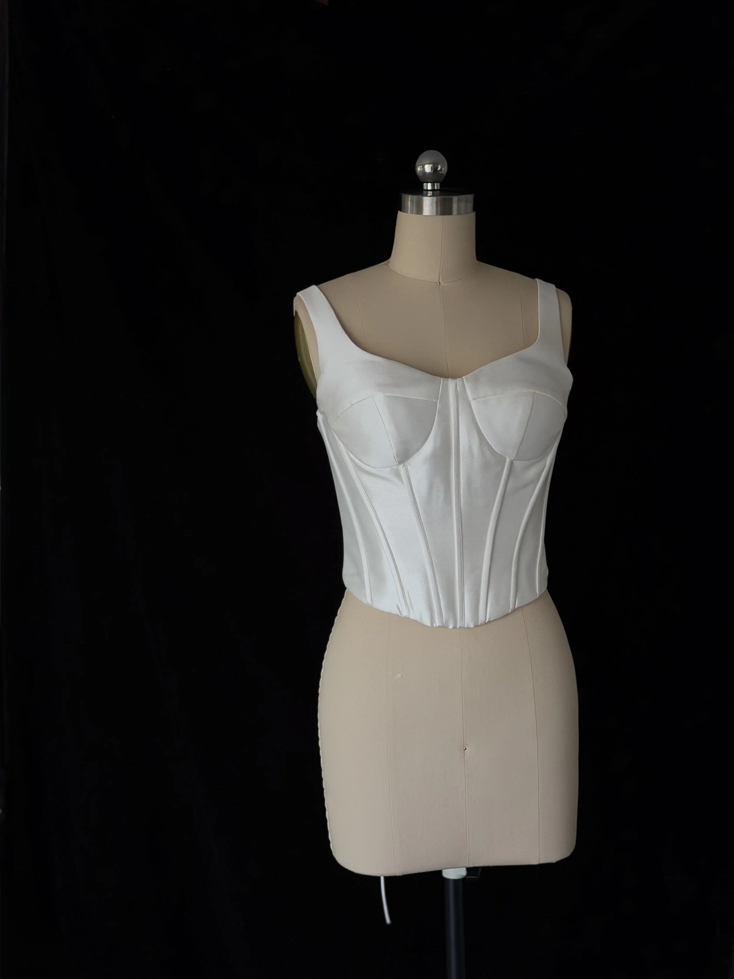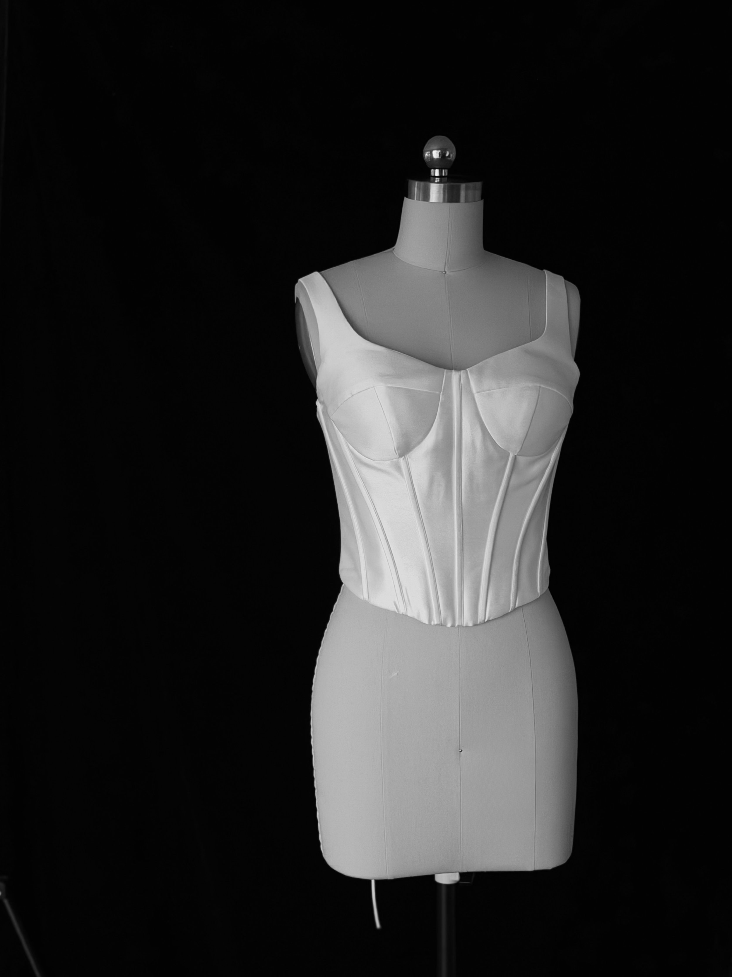 Noe is a structured corset top defined by precise panel construction and internal boning. Contoured bust cups provide shape and support, while clean vertical seams create a controlled, architectural profile designed for versatile styling.