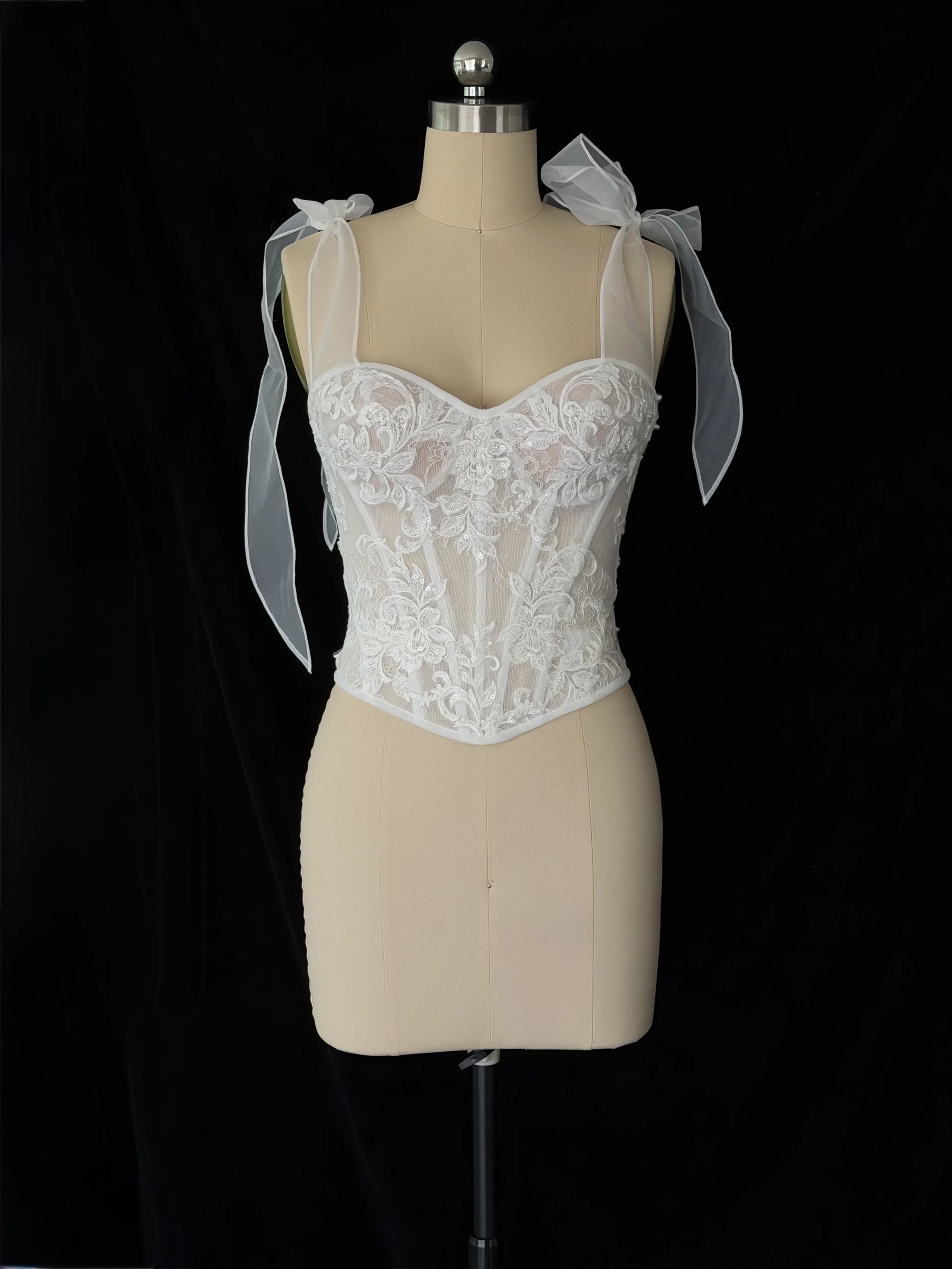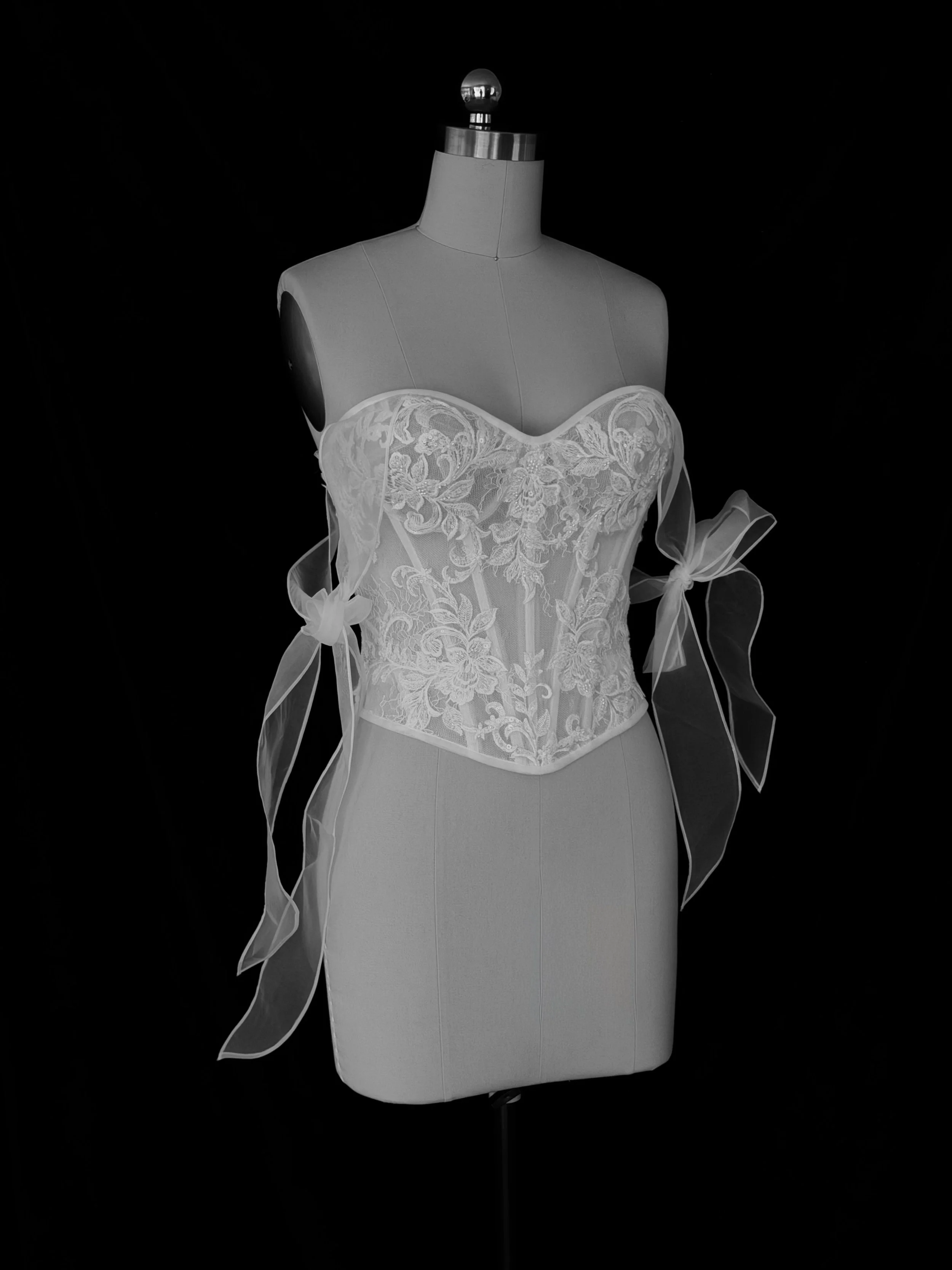 NOÏ is a structured lace corset top built on a sheer, boned foundation with hand-applied lace detailing. The adjustable ribbon straps allow the piece to be worn either on the shoulder or styled off the shoulder, offering flexibility without compromising structure.