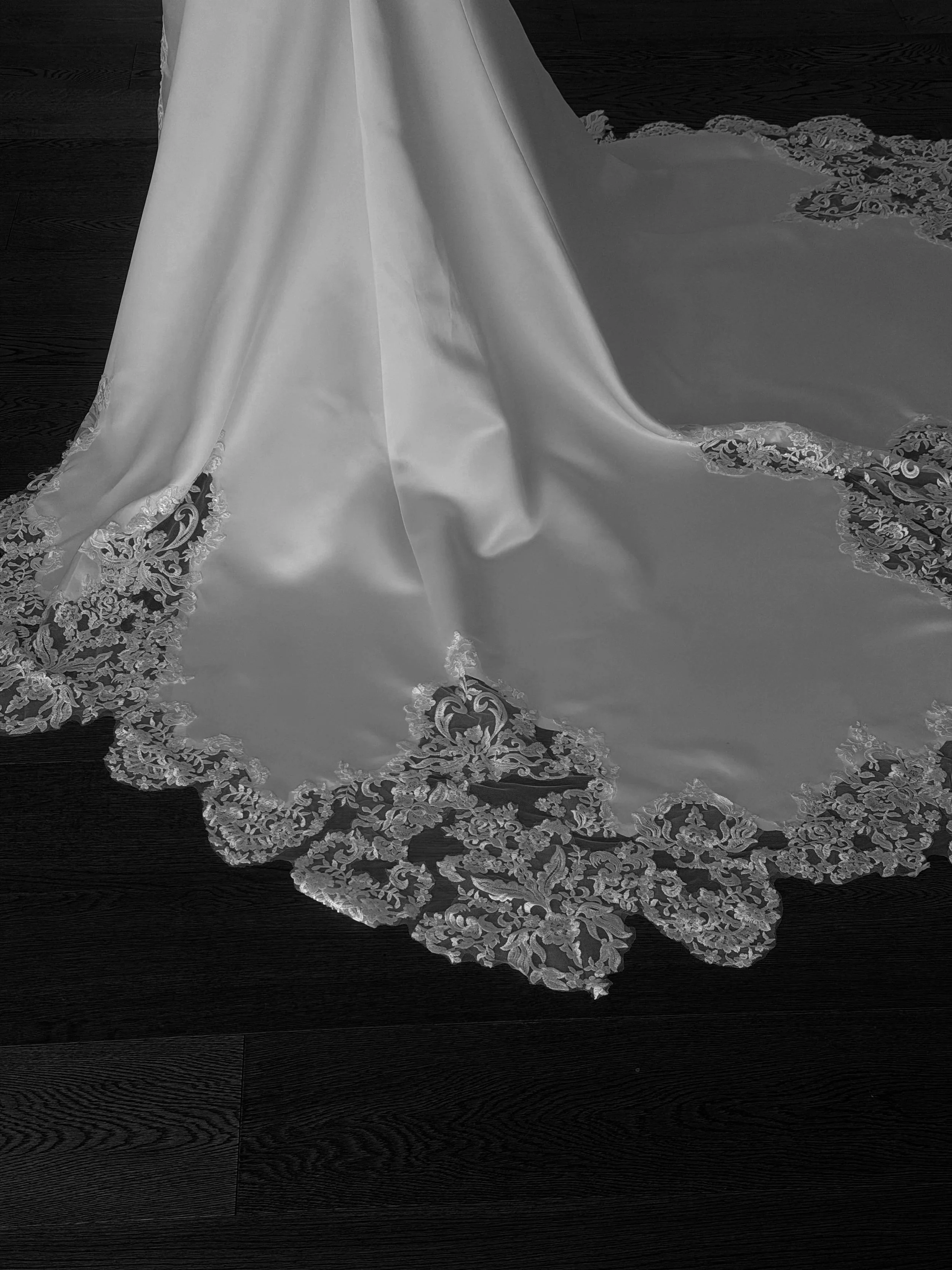 Odette pairs a finely embroidered lace bodice with a lustrous acetate satin skirt, creating a clear contrast between texture and surface. The lace extends into the waist with controlled placement, while the satin skirt falls cleanly with a soft, reflective sheen.